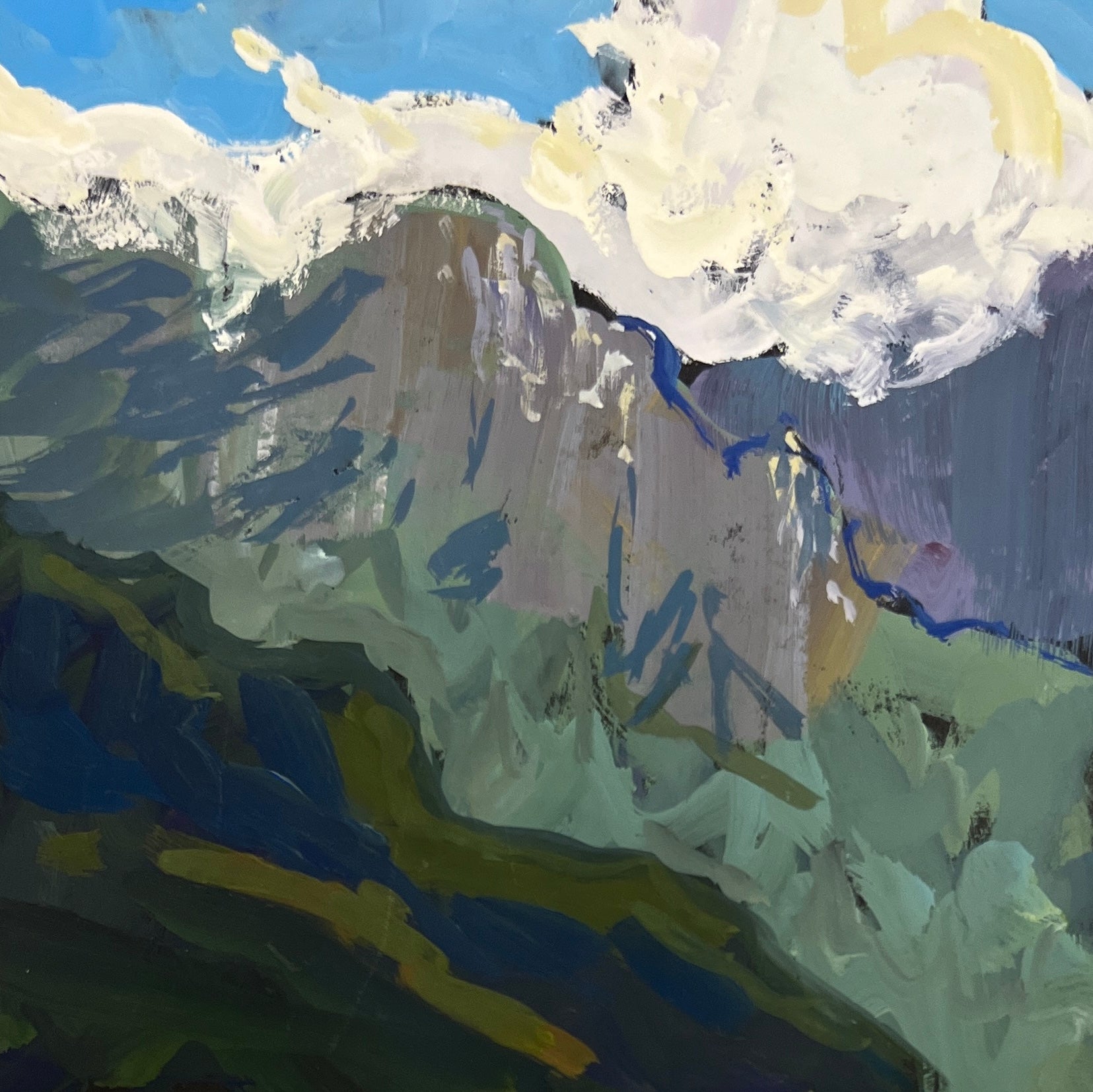 Original contemporary impressionistic gouache painting by Joe G. Painted en plain air (on location) on a partly cloudy morning in September 2024 in Anzola d'Ossola, Italy. 6x6 inches. Looks a lot like Blodgett Canyon in Montana, USA too. This painting comes in a classy, thin, black 1/2 inch frame and is ready to hang or display on a flat surface with attached fold-out easel.