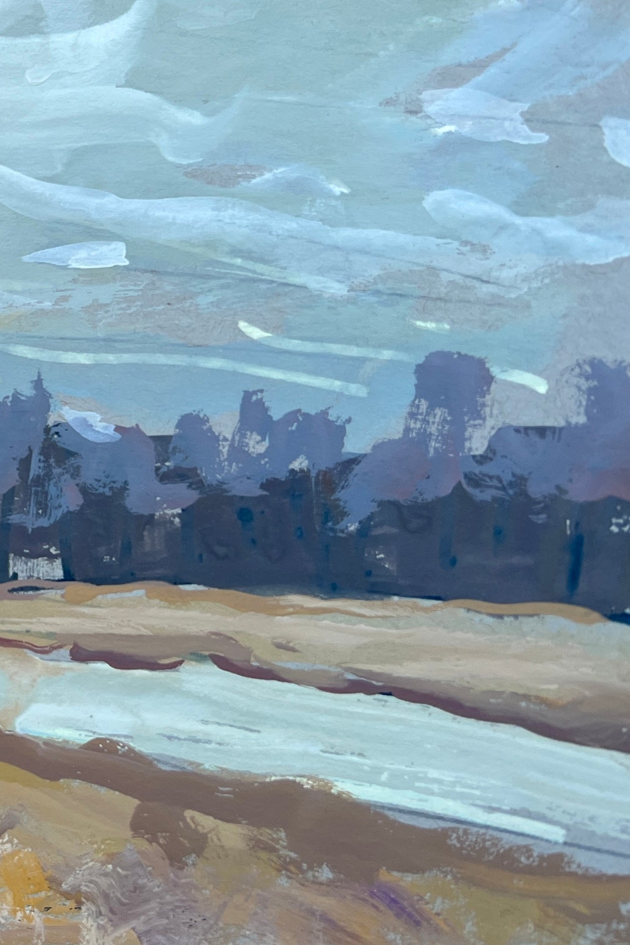 Original contemporary impressionistic gouache painting by Joe G. Painted en plain air (on location) on a cold, dreary afternoon in November 2024 in Hamilton, Montana. 4x6 inches. This painting comes in a classy, thin, black 1/4 inch frame and is ready to hang or display on a flat surface with attached fold-out easel.