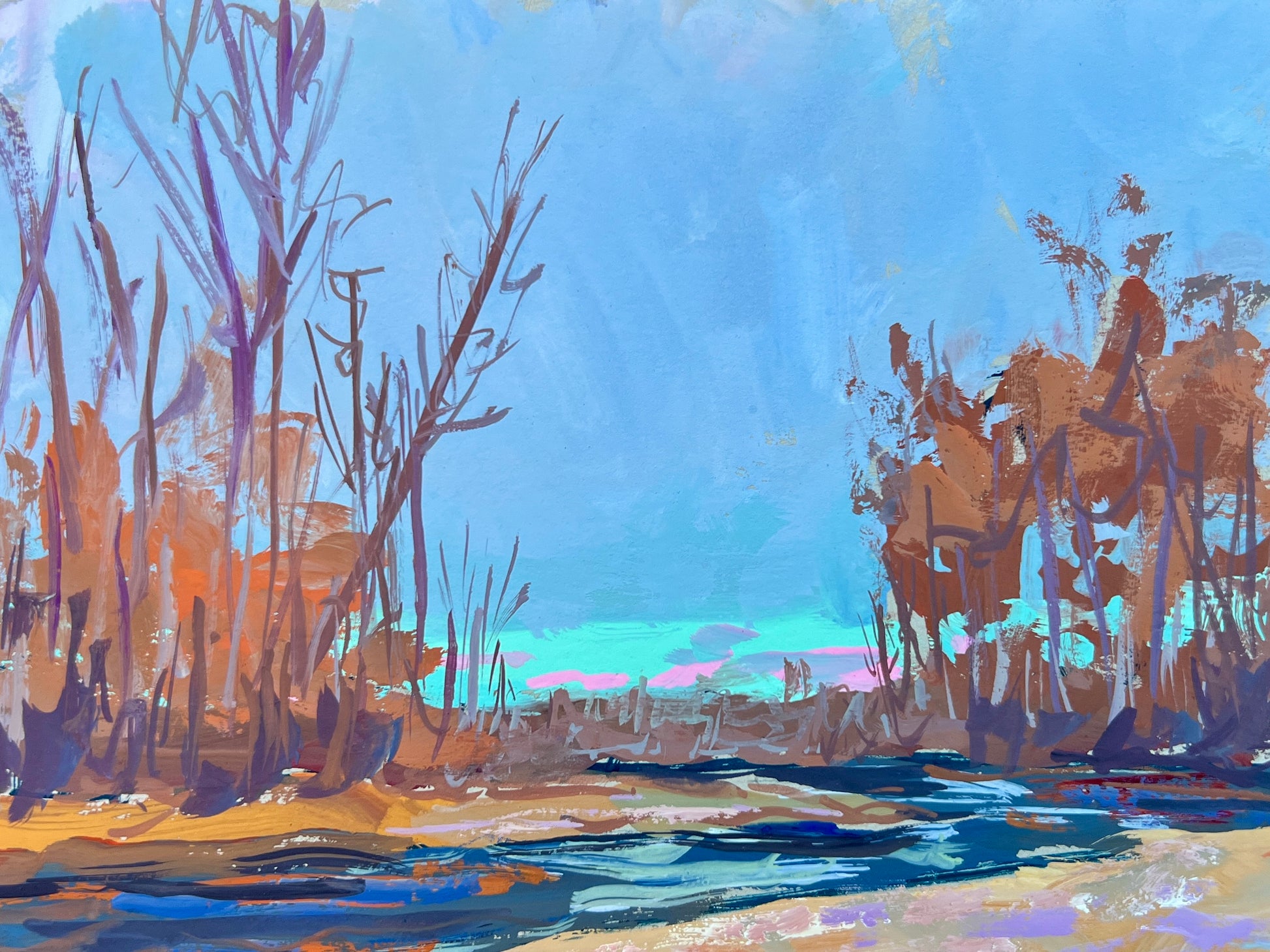Original contemporary impressionistic gouache painting by Joe G. Painted en plain air (on location) on a quiet, dreary, fall evening in November 2024 in Hamilton, Montana. 6x8 inches. This painting comes in a classy, thin, black 1/4 inch frame and is ready to hang or display on a flat surface with attached fold-out easel.